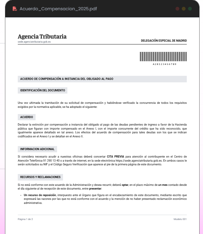 Una vez ultimada la tramitación de su solicitud de compensación y habiéndose verificado la concurrencia de todos los requisitos exigidos por la normativa aplicable, se ha adoptado el siguiente: